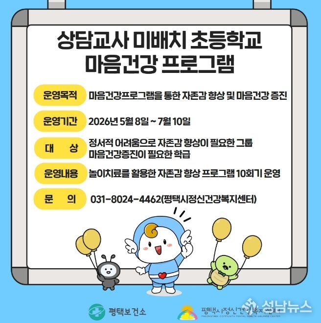 평택시는 상담교사가 배치되지 않은 초등학교 학생들의 정신건강 지원을 위해 ‘마음건강 프로그램’을 운영한다고 밝혔다.