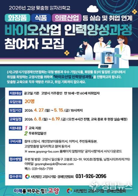 고양특례시는 2026년 고양맞춤형 일자리학교 공모사업 중 ‘바이오산업 인력 양성과정’의 참여자를 모집한다.