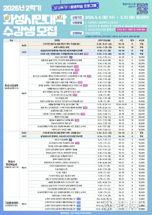 화성특례시는 2026년 화성시민대학 2학기 수강생을 오는 5월 4일부터 5월 10일까지 선착순으로 모집한다고 밝혔다.