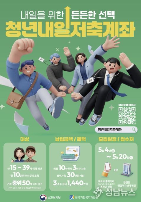 부천시는 일하는 저소득층 청년의 안정적인 사회 정착과 자산 형성을 지원하기 위해 ‘2026년 청년내일저축계좌’ 신규 가입자를 5월 4일부터 5월 20일까지 모집한다.