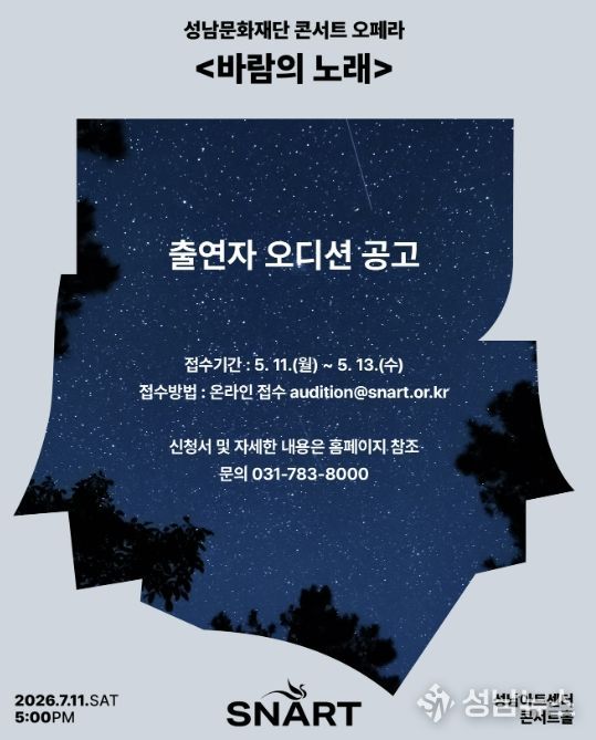 오디션은 5월 19일 오후 2시부터 성남아트센터 콘서트홀에서 피아노 반주에 맞춘 지정곡 가창으로 진행되며, 합격자는 5월 22일 발표될 예정이다. 선발된 성악가는 연습을 거쳐 오는 7월 11일, 본 공연 무대에 오르게 된다. 오디션 관련 자세한 사항은 성남문화재단 홈페이지를 참고하거나, 성남문화재단 공연기획부로 문의하면 된다.