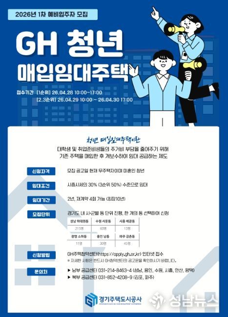 경기주택도시공사(GH)가 청년층 주거 부담을 덜고 안정적인 생활 기반을 마련할 수 있도록 청년 및 자립준비 청년을 위한 매입임대주택 예비입주자 396명을 모집한다고 27일 밝혔다.