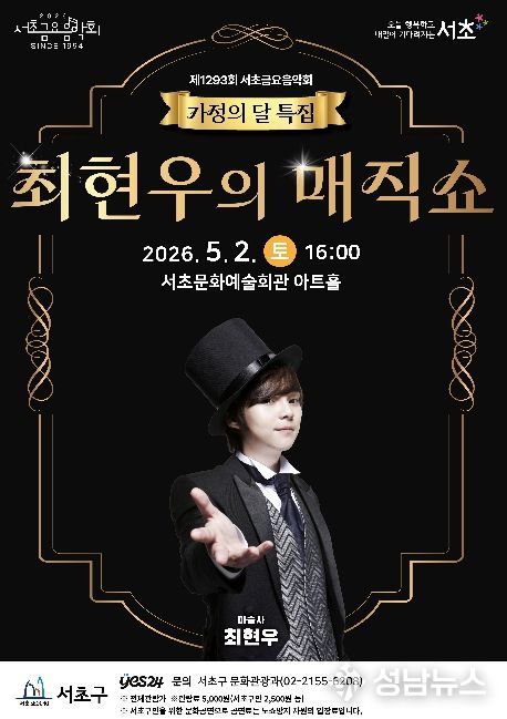 서울 서초구가 가정의 달 5월을 맞아 오는 5월 2일 토요일 오후 4시, 서초문화예술회관 아트홀에서 서초토요콘서트 '최현우의 매직쇼'를 개최한다고 밝혔다.