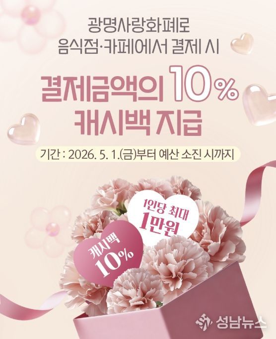 시는 오는 5월 1일부터 5월 한 달간 음식점·카페에서 광명사랑화폐로 결제하는 경우 결제 금액의 10%를 환급하는 ‘가족 외식비 캐시백 지원사업’을 추진한다고 28일 밝혔다.