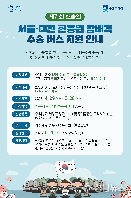 수원특례시가 제71회 현충일인 6월 6일, 국립현충원(서울·대전)까지 이동이 여의치 않은 국가유공자 유족을 위해 현충원 왕복 수송버스를 운행한다.