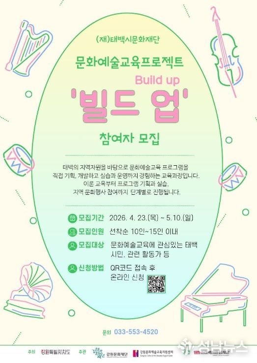 (재)태백시문화재단은 지역 문화예술교육 인력 양성과 지속 가능한 문화예술 생태계 조성을 위해 '2026 태백 문화예술교육 프로젝트 ‘빌드 업(Build up)’' 참여자를 모집한다.