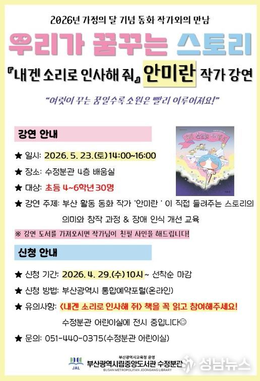 부산광역시립중앙도서관은 다음달 23일 중앙도서관 수정분관에서 초등학생 4~6학년 30명을 대상으로 가정의달 기념 안미란 동화 작가와의 만남 ‘우리가 꿈꾸는 스토리’를 운영한다.