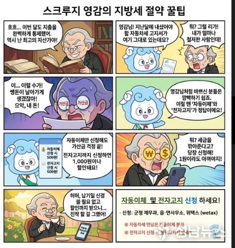 청양군이 스마트폰 환경에 익숙한 군민들을 위해 친숙한 캐릭터를 활용한 웹툰 ‘스크루지 영감의 지방세 절세 꿀팁’을 제작하고, 자동이체 및 전자고지 신청 독려에 나섰다.