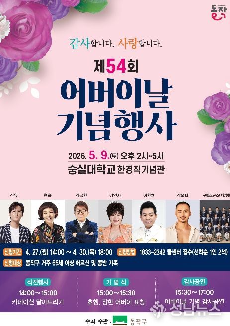 동작구가 오는 5월 9일 오후 2시 숭실대학교 한경직기념관에서 ‘제54회 어버이날 기념행사’를 개최한다고 밝혔다.