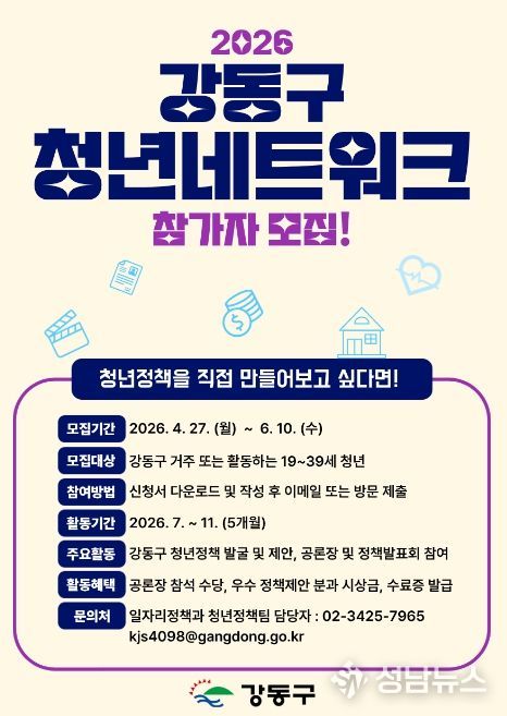 서울 강동구는 ‘2026년 강동구 청년네트워크’ 참여자를 모집한다고 밝혔다. 청년네트워크는 청년들이 직접 의제를 발굴하고 정책을 제안하는 사업이다.