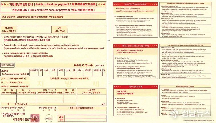 고지서 전면에는 납부 방법·기한·체납 시 불이익 등 주요 정보와 납부 절차를 외국인 체납자의 주요 사용 언어를 반영해 영어와 중국어로 병기했다.