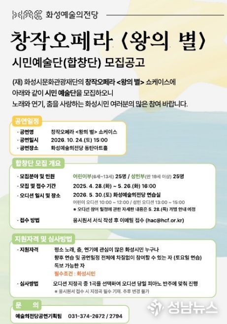 (재)화성시문화관광재단은 오는 10월 개최 예정인 창작오페라 '왕의 별' 쇼케이스 무대에 참여할 시민합창단을 모집한다.
