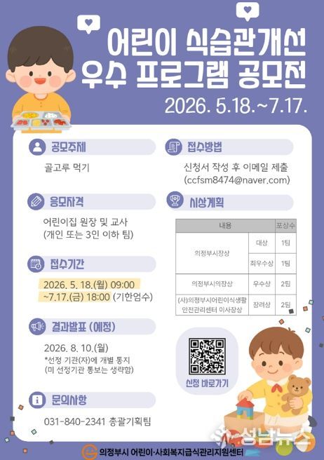 의정부시가 운영하는 의정부시 어린이‧사회복지급식관리지원센터는 어린이 보육시설을 대상으로 5월 18일부터 7월 17일까지 ‘어린이 식습관 개선 우수 프로그램 공모전’을 개최한다.
