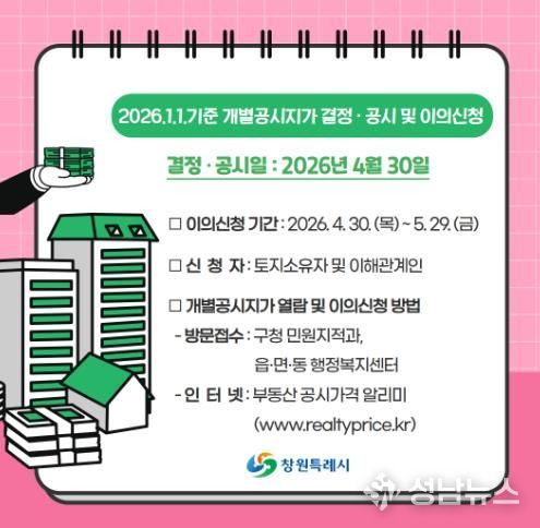 창원특례시는 2026년 1월 1일 기준 개별공시지가 36만 5933필지를 4월 30일 결정·공시하고, 오는 5월 29일까지 이의신청을 접수한다고 밝혔다.