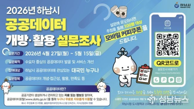 하남시는 시민과 기업, 연구기관 등 다양한 수요자의 의견을 반영해 공공데이터 개방 및 활용을 확대하고자 ‘2026년 하남시 공공데이터 설문조사’를 실시한다고 밝혔다.