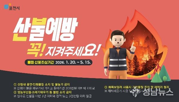 포천시는 시민들에게 영농부산물·쓰레기 불법 소각 금지, 산행 시 라이터·버너 등 화기 소지 및 흡연 금지, 입산통제구역과 등산로 폐쇄 구간 출입 금지 등 산불예방 수칙 준수를 당부했다.