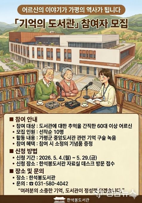 가평군 한석봉도서관이 오는 5월부터 어르신들의 생생한 목소리로 지역의 옛 기록을 수집하는 ‘기억의 도서관’ 프로그램을 운영한다. 실버층 특화 사업인 ‘말랑말랑 추억 교실’의 일환으로 추진되는 이번 사업은 지역 문화 자산을 확보하고 세대 간 기억을 공유하고자 기획됐다.