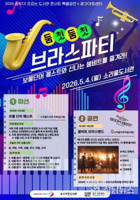 오산시 소리울도서관은 제104회 어린이날을 앞둔 오는 5월 4일 경기아트센터와 협업해 ‘2026 음악이 흐르는 도서관 콘서트’ 특별공연인 ‘둠칫둠칫 브라스 파티’를 개최한다고 밝혔다.