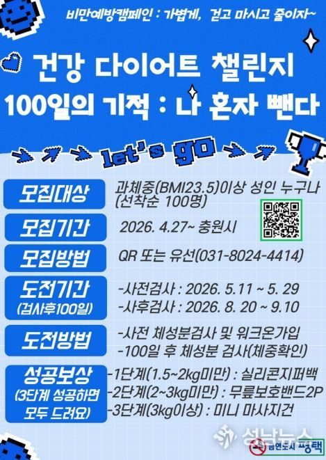 평택시는 시민들이 스스로 비만 관리 능력을 키우고 건강한 생활 습관을 정착시킬 수 있도록 돕는 비만 예방 프로그램 '100일의 기적’참가자를 모집한다고 밝혔다.