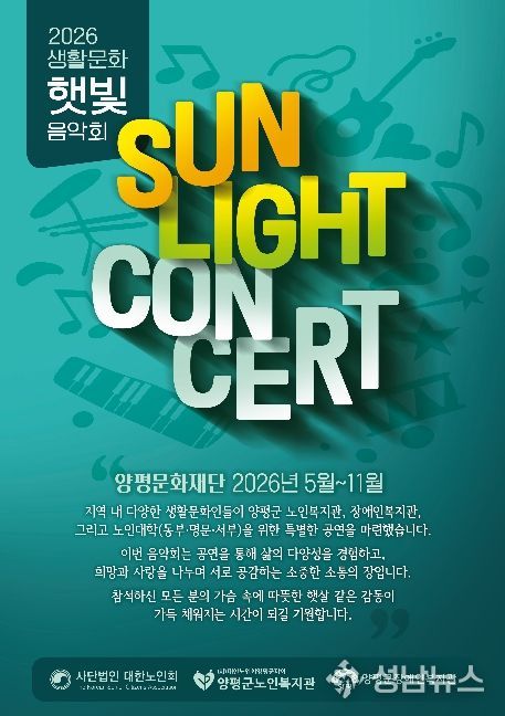 (재)양평문화재단은 관내 문화 예술 향유 기회를 확대하기 위해 찾아가는 음악회 ‘2026 햇빛 음악회’를 오는 5월 8일부터 본격적으로 운영한다고 밝혔다.