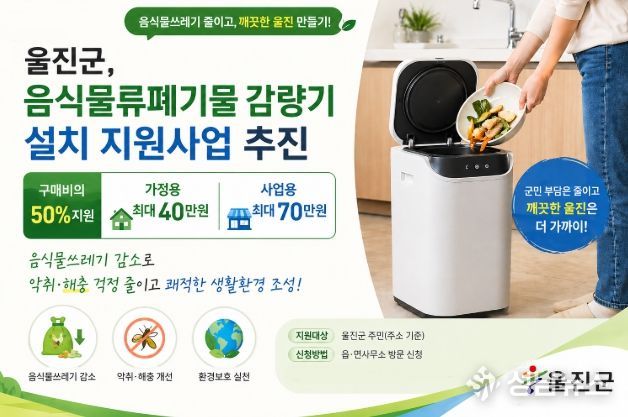 울진군은 음식물쓰레기의 발생량 감소와 군민 생활환경 개선을 위해 ‘음식물류폐기물 감량기 설치 지원사업(3차)’을 오는 5월 22일까지 선착순으로 모집한다.