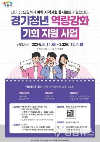 이천시가 오는 5월 11일부터 미취업 청년의 어학·자격시험 응시료를 지원하는 ‘경기청년 역량강화 기회지원 사업’ 대상자 모집에 들어간다.