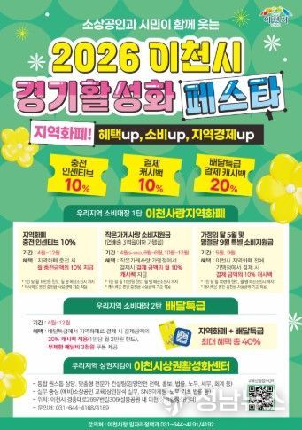 한편, 이천시에서 연말까지 진행하고 있는 ‘2026 이천시 경기활성화 페스타’의 주요 혜택 내용은 ➀지역화폐 충전 시 인센티브 10% 지급(월10만 원 한도) ➁작은가게(연매출 3억 원 이하 가맹점)에서 결제 시 10% 캐시백 지급[월 10만 원 한도 / 5월(가정의 달), 9월(추석달)은 전체 가맹점에서 결제 캐시백 혜택] ➂배달특급에서 지역화폐 결제 시 추가 20% 캐시백 지급 혜택(월 2만 원 한도) 등이 있으며, 배달특급에서 지역화폐로 결제할 경우 최대 40%까지 할인되는 놀라운 혜택을 볼 수 있다.