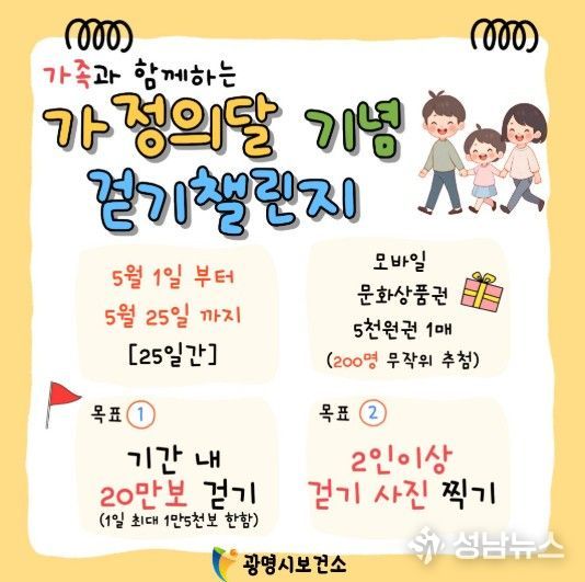 광명시가 오는 5월 가정의 달을 맞아 시민 건강을 증진하고 가족 유대를 강화하고자 ‘2026년 가정의 달 기념 걷기 챌린지’를 운영한다.