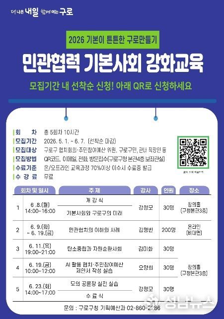 구로구가 오는 6월 민관협치 활성화와 주민참여 확대를 위해 ‘민관협력 기본사회 강화교육’을 운영하고 5월 1일부터 교육생을 선착순으로 모집한다.