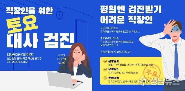 서울 강북구 보건소 건강관리센터가 평일에 시간을 내기 어려운 직장인들의 건강 회복을 위해 ‘직장인 맞춤형 토요 대사증후군 검진 서비스’를 운영하며 구민 건강권 확보에 나섰다.