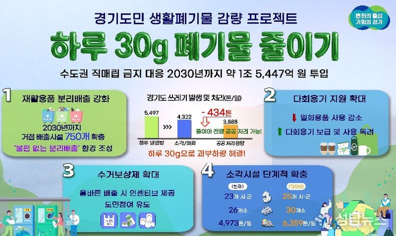 수도권 직매립 금지에 따른 생활쓰레기 감량을 위해 경기도가 2030년까지 5년간 약 1조 5,447억 원을 투입하는 ‘하루 30g, 도민실천형 생활폐기물 감량 프로젝트’를 추진한다.