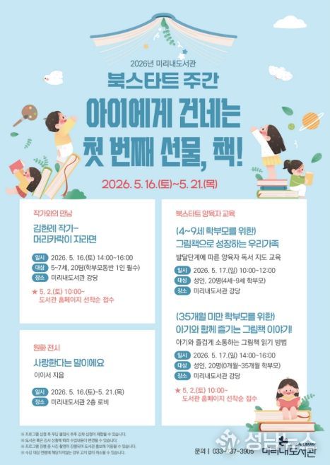 원주시 미리내도서관은 다음 달 16일부터 21일까지 북스타트코리아와 함께 ‘아이에게 건네는 첫 번째 선물, 책!’을 주제로 북스타트 주간 프로그램을 운영한다.