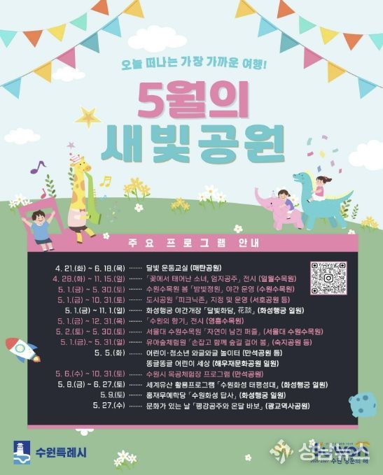 수원특례시는 5월 한 달간 도시공원과 수목원, 수원화성 일원에서 시민 참여형 자연·문화·체험 프로그램을 운영한다. 가정의 달을 맞아 가족 단위로 공원에서 여가와 체험을 함께 즐길 수 있도록 프로그램을 확대했다.