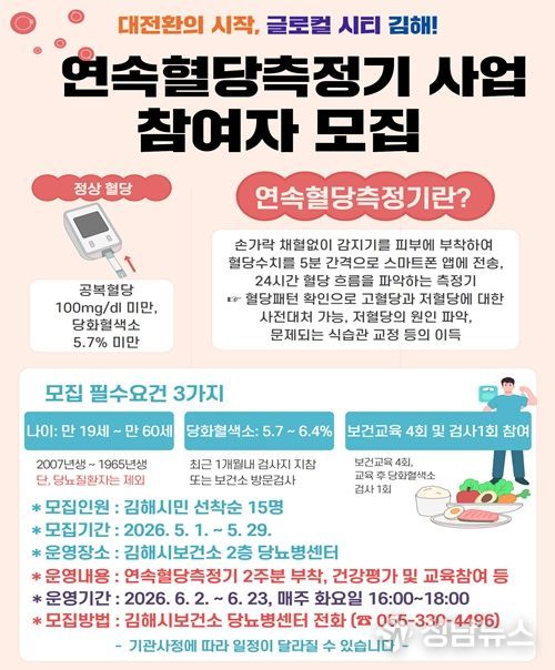 김해시보건소 당뇨병센터는 오는 5월 1일부터 29일까지 당뇨병 예방과 자가건강관리 역량 강화를 위한 연속혈당측정기 사업 대상자를 모집한다고 30일 밝혔다.