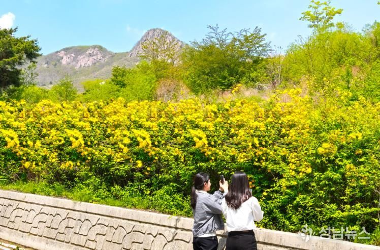 29일 산청군 황매산 정상이 바라보이는 차황면 황매산로에 황매화가 만개해 방문객들의 눈길을 끈다.