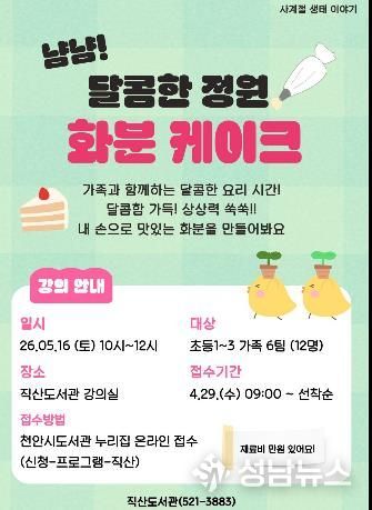 천안시 직산도서관은 내달 16일 ‘냠냠! 달콤한 정원, 화분 케이크’를 운영한다고 29일 밝혔다.