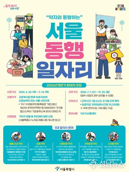 참여를 희망하는 시민은 5월 14일까지 주소지 동주민센터에서 상담 및 신청이 가능하다. 대상은 18세 이상 서울시민으로, 가구원 합산 중위소득 85% 이하이면서 합산재산 4억 9,900만 원 이하인 경우 신청할 수 있다. 최종 선발된 참여자는 1일 6시간, 주 5일 근무하며 일급은 62,000원 수준으로 월 평균 세전 약 180만 원을 받는다.