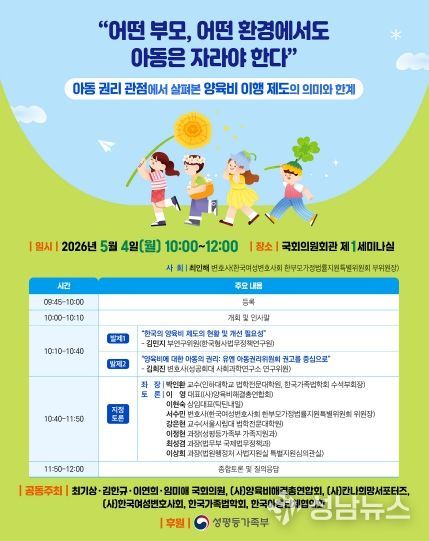 어린이날을 하루 앞두고 개최되는 이번 토론회는 아동권리의 관점에서 양육비 제도의 이행 현황과 개선점을 논의하는 자리로, 4인의 국회의원과 (사)양육비해결총연합회, (사)칸나희망서포터즈, (사)한국여성변호사회, 한국가족법학회, 한국아동단체협의회가 공동주최하고, 성평등가족부가 후원 기관으로 참여한다.