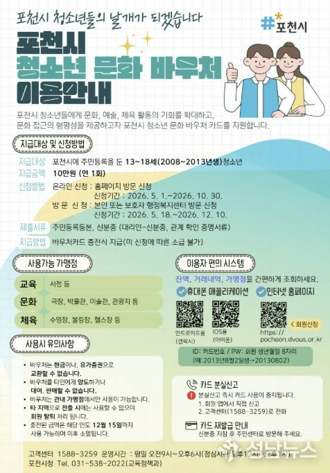 이번 사업은 포천시에 주민등록을 둔 13세부터 18세까지의 청소년에게 1인당 연 10만 원 상당의 문화 바우처를 지원하는 사업이다. 바우처는 관내 등록 가맹점에서 사용할 수 있으며, 영화, 공연, 체육활동, 체육용품 구입, 서점 등 다양한 문화·예술·체육 분야에서 이용할 수 있다.