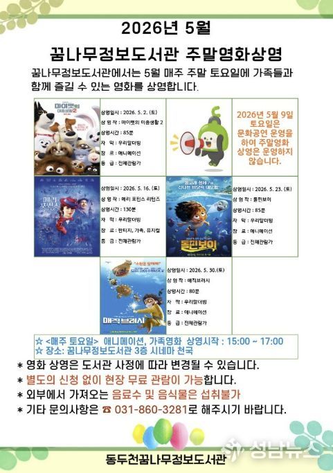 도서관 관계자는 "5월에 도서관에서 재미있는 영화를 보며 아이와 부모가 함께 유쾌하고 즐거운 시간을 보내길 바란다”라고 말했다.