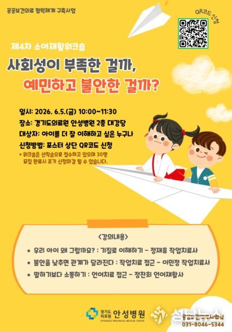 행사는 2026년 6월 5일 오전 10시부터 11시 30분까지 경기도의료원 안성병원 2층 대강당에서 진행되며, 주요 내용은 아동 기질 이해(작업치료 접근), 불안 감소를 통한 관계 개선, 언어 및 의사소통 중심 상호작용 방법 등으로 구성된다. 참가 대상은 “아이를 더 잘 이해하고 싶은 누구나”이며, 선착순 30명으로 모집한다. 신청은 포스터 내 QR코드 및 유선 접수를 통해 가능하며 조기 마감될 수 있다.