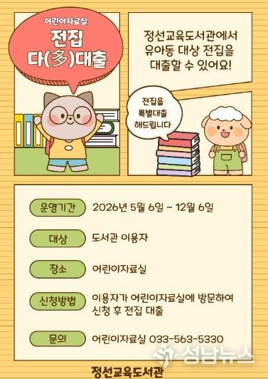 정선교육도서관은 5월 6일부터 12월 6일까지 어린이자료실에서 어린이자료실 이용 활성화와 지역 내 독서 문화 확산을 위해 ‘전집다(多)대출’을 운영한다.