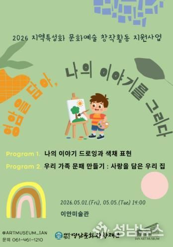 (재)영암문화관광재단은 오는 5월 1일과 5월 5일 오후 2시, 이안미술관에서 ‘영암을 담아, 나의 이야기를 그리다’라는 주제로 문화예술 교육 프로그램을 진행한다.