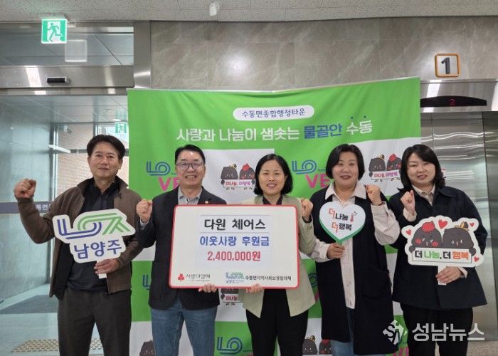 남양주시는 지난 28일 수동면 소재 다원체어스가 수동면 어르신들을 위한 후원금 240만 원을 수동면 지역사회보장협의체에 전달했다고 29일 밝혔다.
