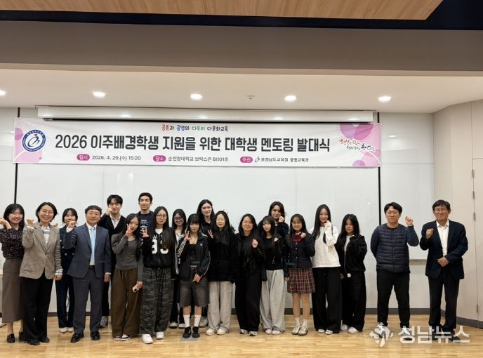 충남교육청은 29일, 순천향대학교(아산)에서 순천향대 지도자 학생 6명과 온양용화고·아산충무고 학생 20명, 담당 교사 등 30여 명이 참석한 가운데 ‘2026 이주배경학생 지원을 위한 대학생 지도 발대식’을 개최했다.