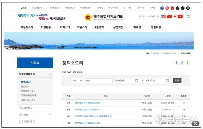 제주특별자치도의회는 입법 및 정책 동향 등 주요 현안에 대한 최신 정보를 도민에게 신속히 제공하기 위하여 '정책 소도리'를 운영하고 있다고 밝혔다.