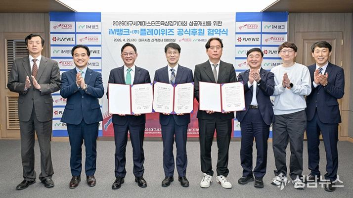 2026대구세계마스터즈육상경기대회 조직위원회는 4월 29일 시청 산격청사에서 iM뱅크 및 ㈜플레이위즈와 대회 공식 후원협약을 체결했다.