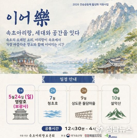 속초시 관계자는 “속초의 자연환경과 어우러진 공간에서 아리랑을 직접 체험할 수 있도록 기획한 프로그램”이라며 “정선군, 원주시 협업을 통해 강원아리랑의 브랜드화를 추진하고 지역문화의 지속 가능한 전승 기반을 마련해 나가겠다”고 말했다.