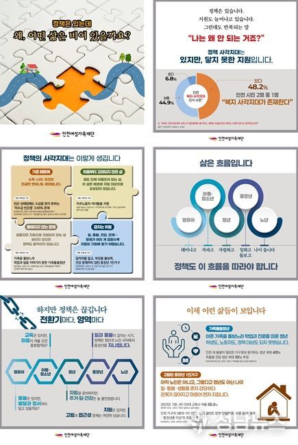 인천여성가족재단은 생애주기별 정책 사각지대 해소를 위해 2025년 수행한 연구보고서 '인천광역시 생애주기별 사각지대 지원 강화 방안 연구'를 바탕으로 카드뉴스를 제작·배포했다.