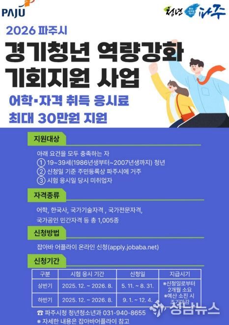 파주시는 청년들의 취업 준비 비용 부담을 낮추고 고른 취업 기회 제공을 위해, 미취업 청년에게 어학·자격시험 응시료를 최대 30만 원까지 지원하는 ‘경기청년 역량강화 기회지원’사업을 추진한다.